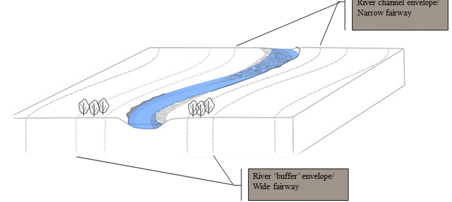Buffers are an envelope of land beyond the river channel which is allocated to provide for erosion control and protection. This is often in the form of vegetation.